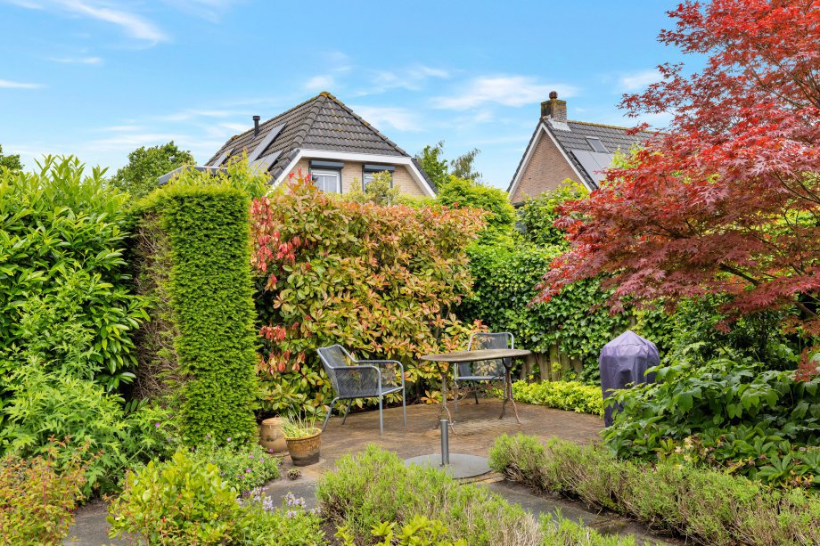 De achtertuin is via een afgesloten zij-ingang te bereiken en heeft diverse terrassen, bestrating (2019 opnieuw gelegd) beplanting, een buitenkraan en een elektrisch bedienbaar zonnescherm. Door de gunstige ligging heeft de achtertuin zowel zon- als schaduwplekken. Ook zijn er 3 heipalen als voorbereiding voor een eventuele uitbouw of serre.